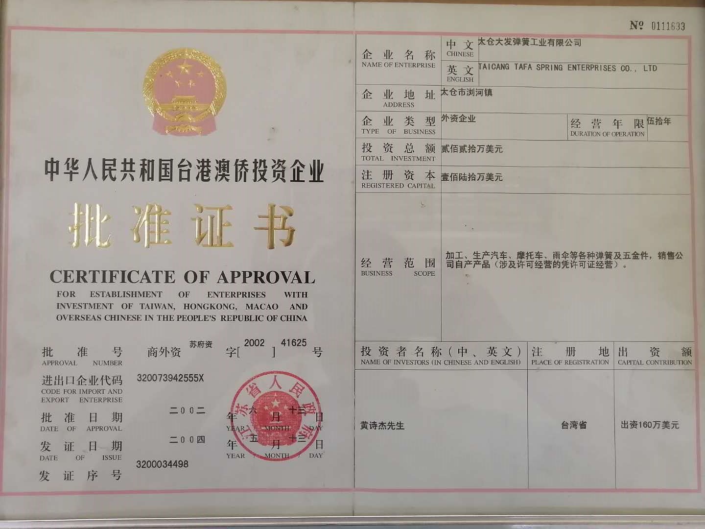 太倉(cāng)大發(fā)彈簧工業(yè)有限公司由黃金樹(shù)先生于1967年始創(chuàng)于臺(tái)灣,是一個(gè)集雨傘、電子、五金機(jī)械、自行車(chē)、摩托車(chē)、汽車(chē)等的彈簧配件生產(chǎn)、加工、輔助設(shè)計(jì)服務(wù)的綜合性企業(yè),其中1990年創(chuàng)辦的廈門(mén)大發(fā)彈簧公司、2000年創(chuàng)辦的深圳大發(fā)彈簧公司、2002年創(chuàng)辦的太倉(cāng)大發(fā)彈簧公司均位于經(jīng)濟(jì)發(fā)展地區(qū),地理位置佳。我們憑借在彈簧制造業(yè)的多年豐富知識(shí)與技術(shù),并著眼于以客戶為導(dǎo)向,秉持“以人為本,以質(zhì)為先,以客為主,持續(xù)創(chuàng)新”的經(jīng)營(yíng)理念,強(qiáng)化競(jìng)爭(zhēng)優(yōu)勢(shì)。公司導(dǎo)入ISO9001: 2000質(zhì)量管理體系,執(zhí)行ISO14000:2000管理方式,倡導(dǎo)安全、高質(zhì)量、高素質(zhì)的生產(chǎn)。